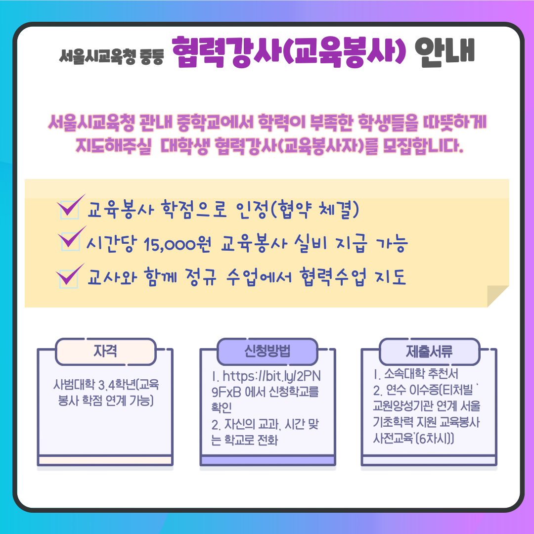 - [교육봉사] 2021학년도 교원양성기관 연계 서울시교육청 기초학력 지원 협력 교육봉사 지원 안내