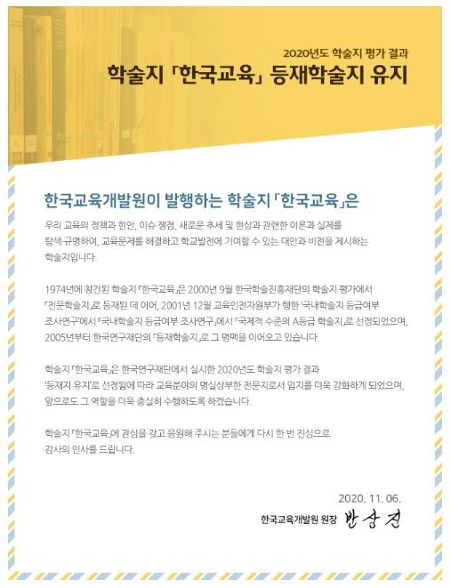 - [일반공지] [한국교육개발원] 학술지 「한국교육」 등재학술지 유지(2020년도 학술지 평가 결과) 안내
