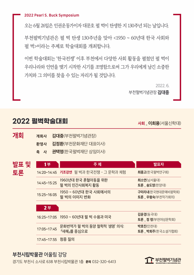 - [부천문화재단] 부천펄벅기념관《2022 펄벅학술대회》개최 안내