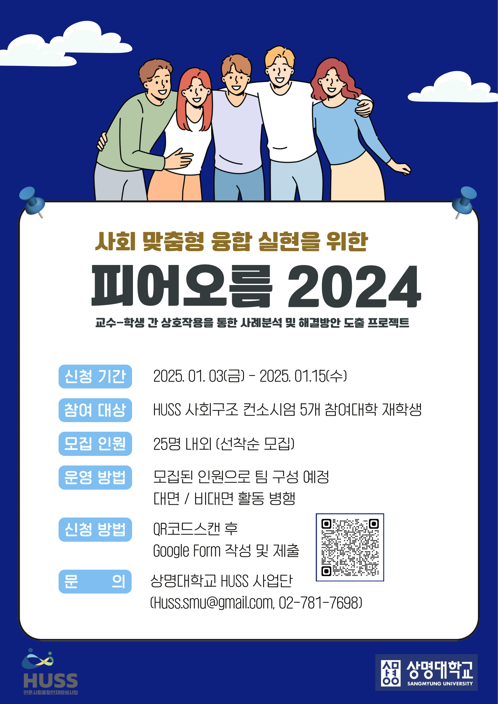 | 상명 [비교과] | [HUSS 인문사회 융합인재양성사업단] 인문사회융합인재양성사업(HUSS) ‘피어오름 2024’ 프로그램 안내 |