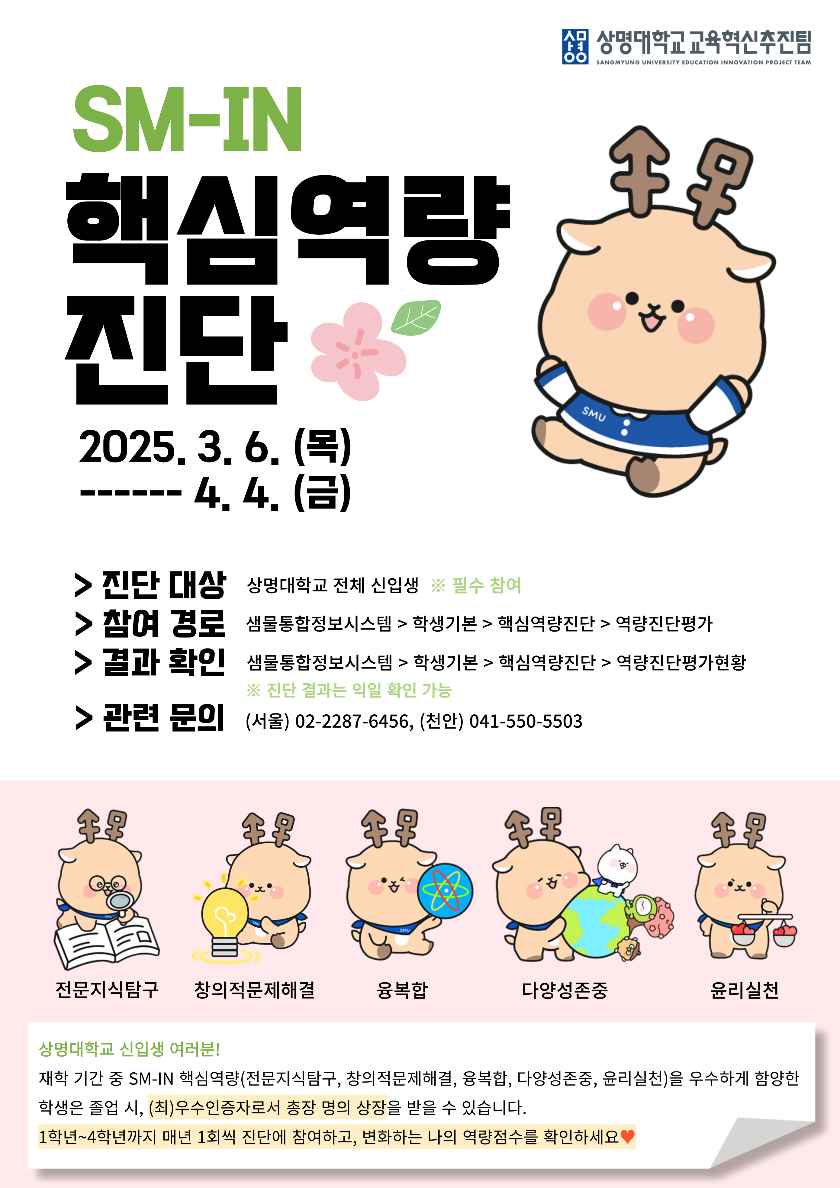 | 상명 [일반] | [교육혁신추진팀] 2025학년도 전체 신입생 대상 SM-IN 핵심역량 진단 참여 안내(필수) |