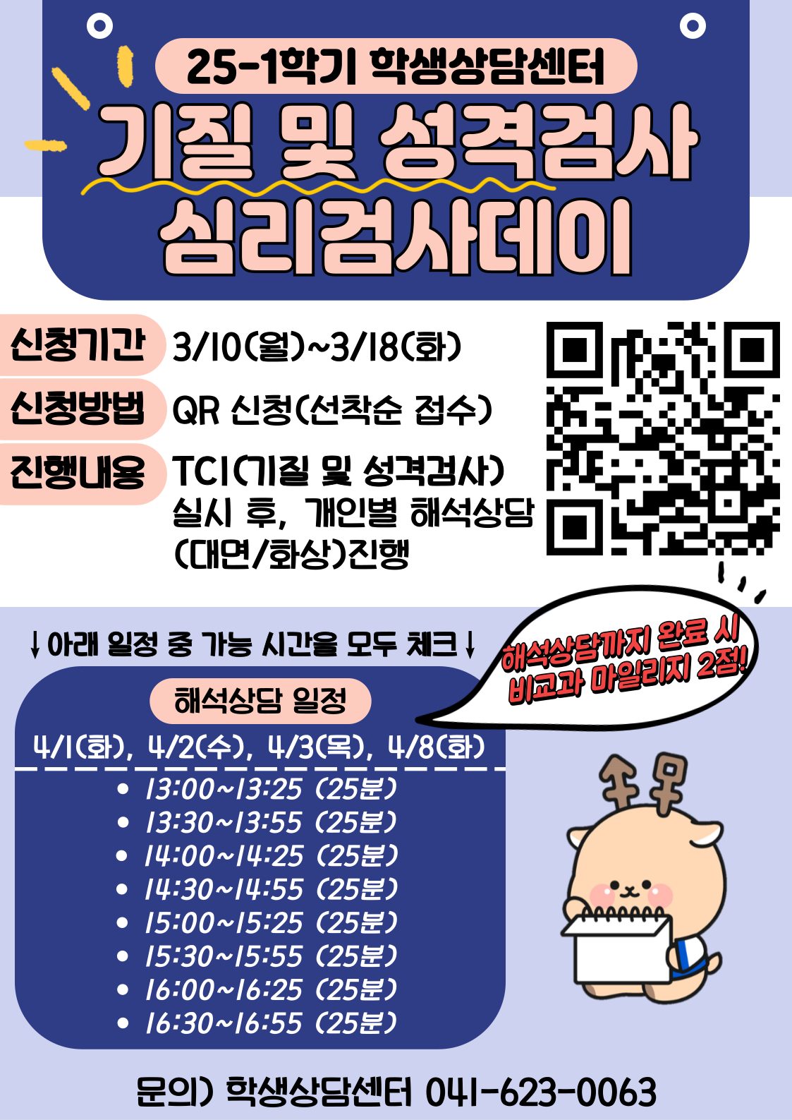| 천안 [학생생활] | [학생상담센터(천안)] 2025학년도 1학기 ‘기질 및 성격검사’ 심리검사데이 신청 안내 |
