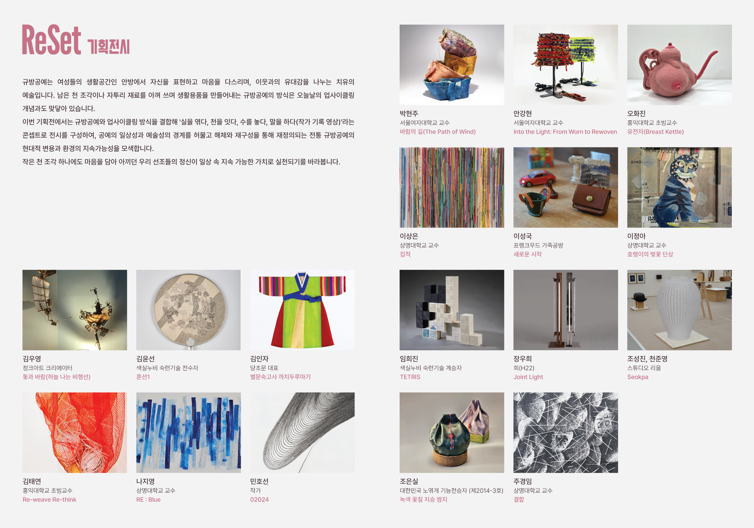 이번 기획전에서는 규방공예와 업사이클링 방식을 결합해 '실을 엮다, 천을 잇다, 수를 놓다, 말을 하다(작가 기록 영상)'라는 콘셉트로 전시를 구성하여, 공예의 일상성과 예술성의 경계를 허물고, 해체와 재구성을 통해 재정의되는 전통 규방공예의 현대적 변용과 환경의 지속가능성을 모색합니다.