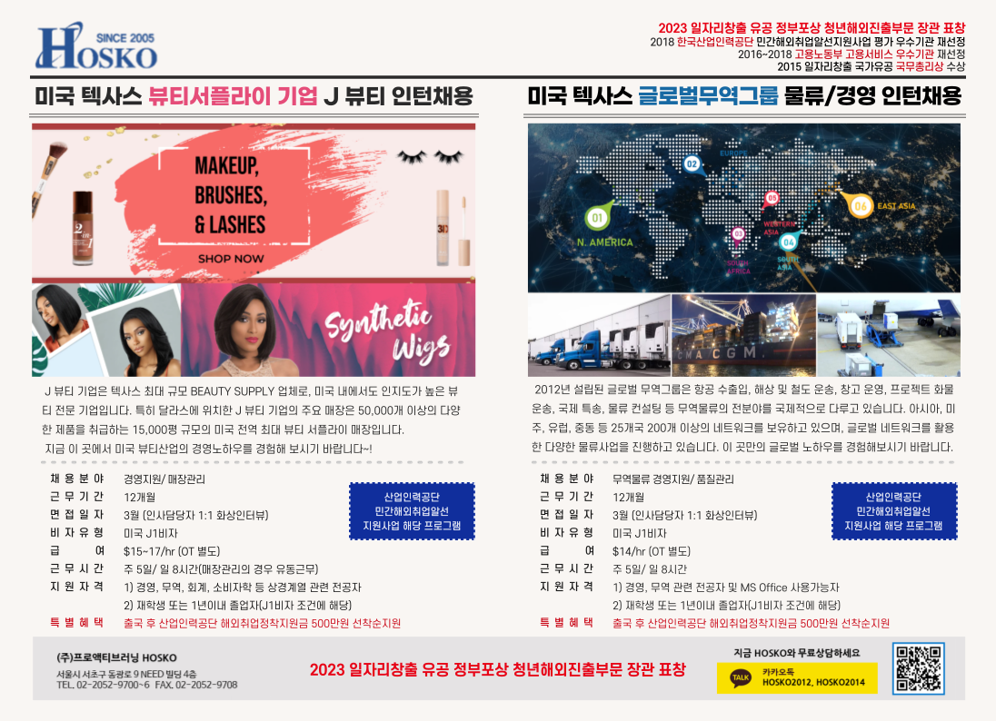 - [인턴쉽] [HOSKO] 미국텍사스 글로벌무역그룹 물류/경영 인턴 채용